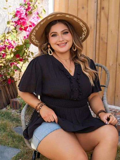 Upgrade your wardrobe with this quirky, plus size notched short sleeve blouse! Perfect for adding a touch of fun to your everyday outfit, this blouse is designed with comfort and style in mind. Stand out from the crowd with this playful and unique piece. (Plus, the notched short sleeves are so on-trend!)