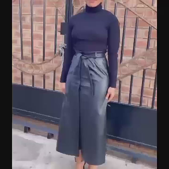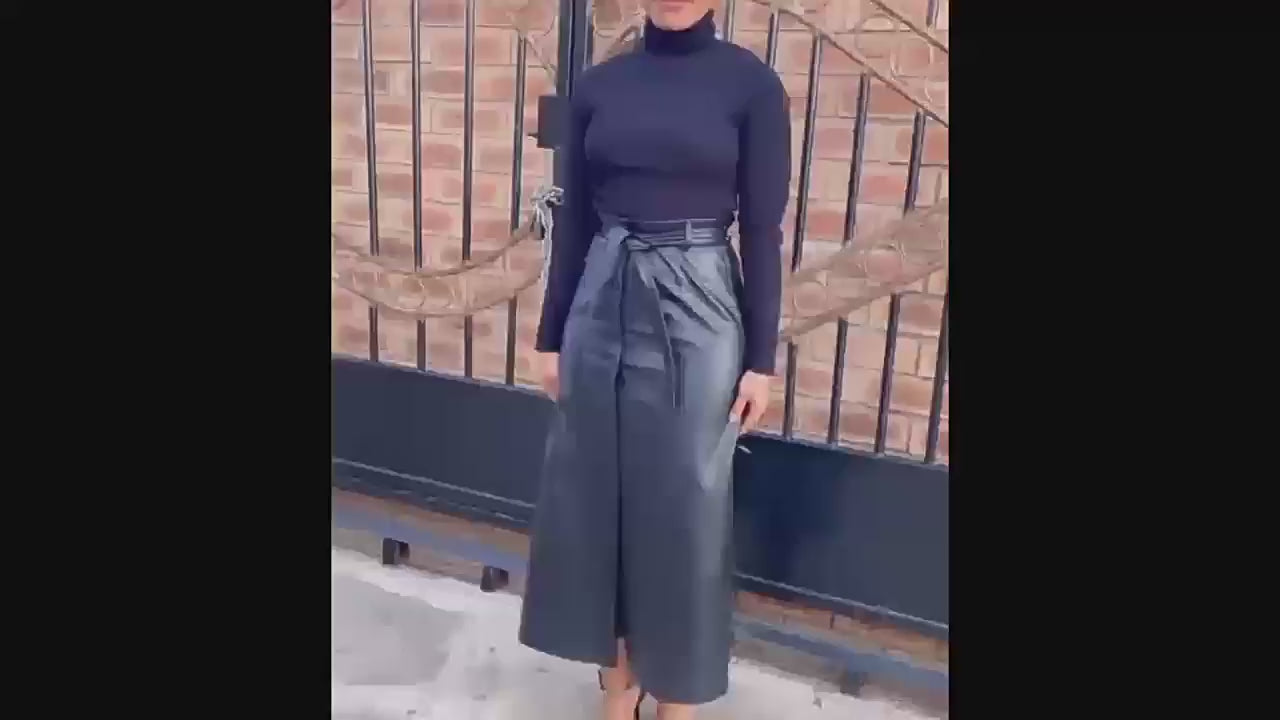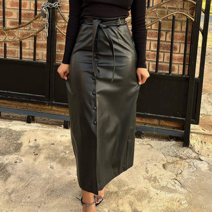 Make a bold statement with our Faux Leather Buckle Slit Leather Belted Skirt! Crafted from high-quality faux leather, this skirt features a chic buckle design and a sexy front slit. The belted waist adds a touch of sophistication to your outfit. Elevate your style game with this must-have piece!