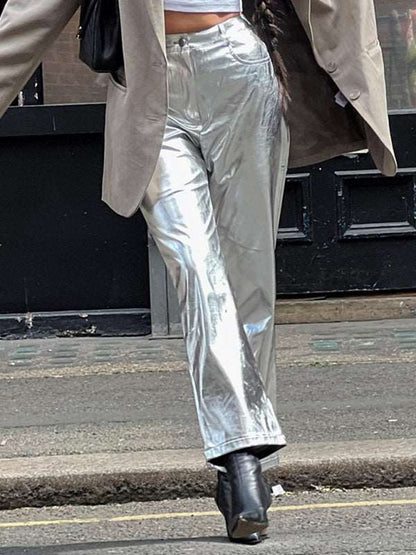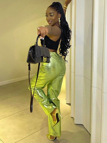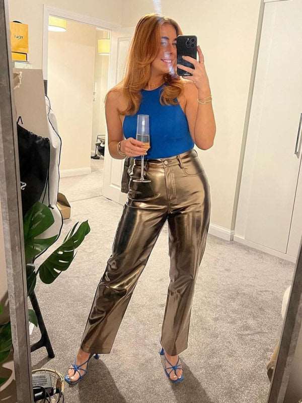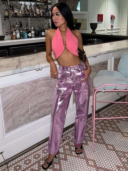 Shake up your wardrobe with our Candy Leather Metallic Pants! These playful and unique pants will add a touch of fun and quirkiness to any outfit. Made with high-quality materials, they are both comfortable and stylish. Step out in style and turn heads with these eye-catching pants. (Warning: may cause jealous stares.)