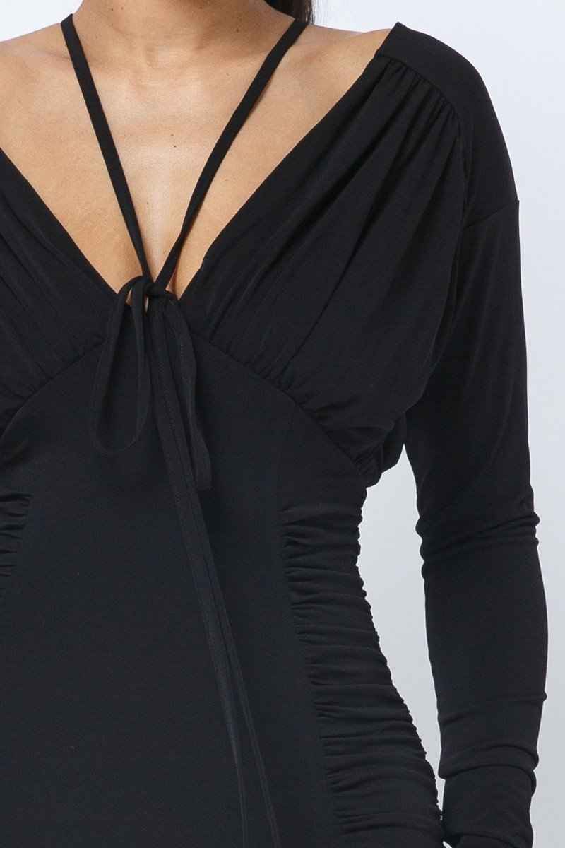 LONG SLEEVE MIDI DRESS WITH LOW V NECK FRONT AND BACK WITH RUCHING ON SIDES AND CHEST