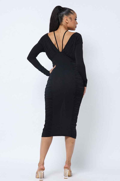 Long Sleeve Midi Dress With Low V Neck Front And Back With Ruching On Sides And Chest