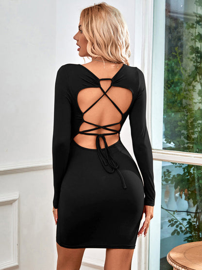 Knitted Square Neck Back Tie Long Sleeve Dress