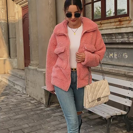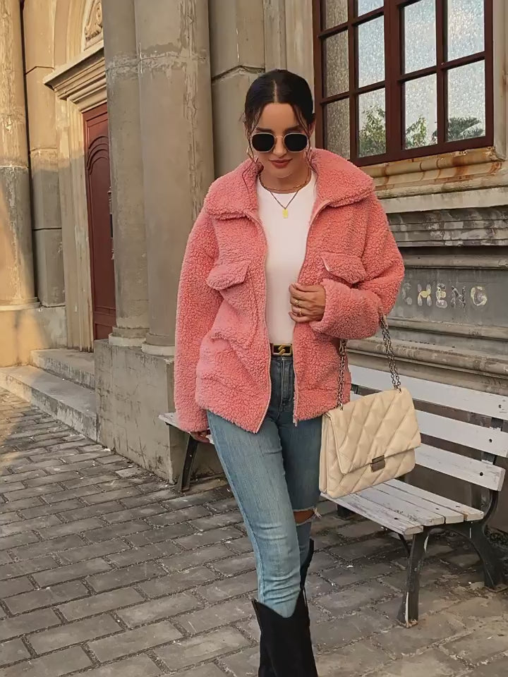 Stay warm and stylish with our Lapel Large Pocket Zip-Up Plush Coat. Featuring a lapel design and spacious pockets, this coat will elevate any outfit. Perfect for chilly days, it's the perfect combination of fashion and function. Don't miss out on this cozy must-have!