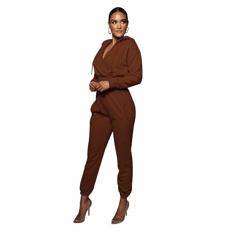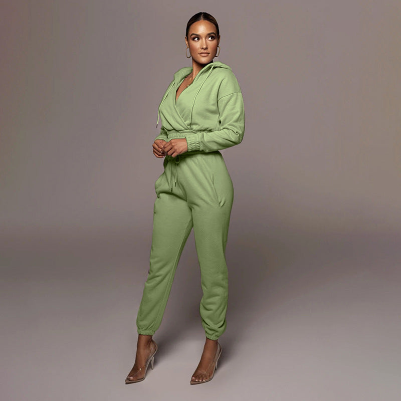 Solid Color Hooded Open V Ankle Sweat Suit